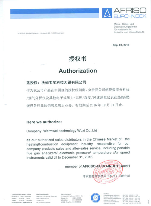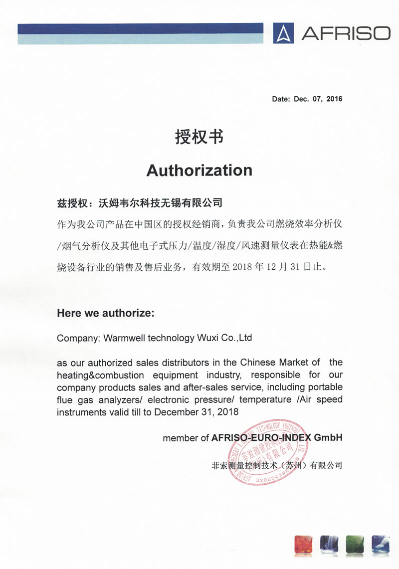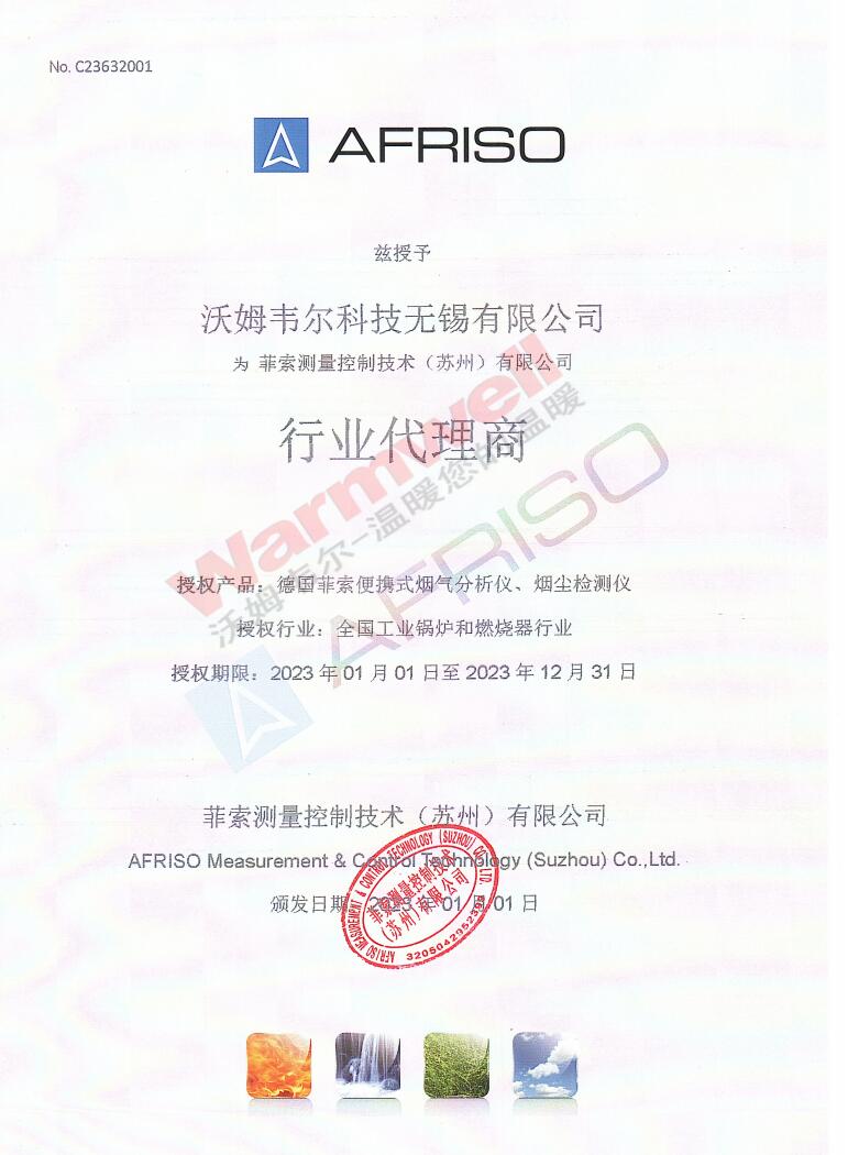 德國菲索(Afriso)行業(yè)授權(quán)代理證書