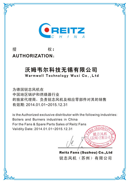 德國銳志(Reitz)風(fēng)機(jī)行業(yè)代理(2014-2015)授權(quán)書