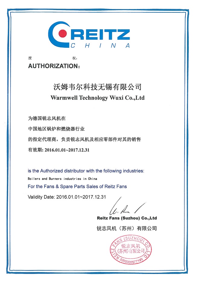 德國銳志(Reitz)風(fēng)機(jī)行業(yè)代理(2016-2017)授權(quán)書